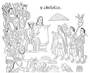 В Теночтитлан испанцы вошли 8 ноября 1519 года и были любезно встречены правителями вассальных городов Истапалапана и Кулуакана. На главной городской площади состоялась встреча Кортеса с тлатоани ацтеков — Монтесумой II. Это событие было записано в местном пиктографическом кодексе следующими словами: