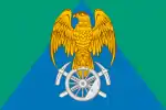 Описание флага: «Прямоугольное полотнище с отношением ширины к длине 2:3, состоящее из трёх треугольников: синего цвета, основанием которого является нижняя сторона полотнища, а вершиной - середина верхней стороны полотнища, и двух зелёного цвета; в центре которого – ястребиный канюк желтого цвета, восседающий на паровозном со спицами колесе белого цвета, наложенном на две скрещенные кирки белого цвета».
