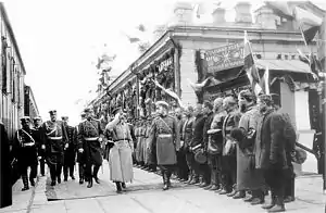 На вокзале, разукрашенном флагами и гирляндами из зелени, собрались многочисленные депутации, масса публики и местное начальство. В версте от вокзала, на плацу выстроились для осмотра полки: 214 — Мокшанский и 282 — Черноярский. Подошёл императорский поезд и грянуло громогласное «Ура!» (…) С Государем прибыли: министр императорского Двора и командующий императорской главной квартирой генерал-адъютант барон Фредерикс, военный министр генерал-адъютант Сахаров, помощник командующего главной квартирой генерал-адъютант граф Олсуфьев, командующий войсками Казанского военного округа генерал от инфантерии Косич, начальник штаба округа генерал Зандер, лейб-хирург Гирш, гофмейстер Копыткин, начальник канцелярии министра императорского двора свиты Его Величества генерал-майор Мосолов, флигель-адъютанты: князь Оболенский и граф Гейден…