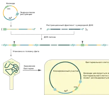 Полученные фаговые частицы с рекомбинантными космидами используют для инфицирования клеток кишечной палочки. В цитоплазме космиды циклизуются благодаря соединению липких концов и действию фермента лигазы, а далее реплицируются как обычные плазмиды, не проявляя никаких свойств фага лямбда. Селекция трансформированных клеток проводится по маркерным геном, присутствующим в векторной молекуле.
