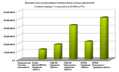 Одним из самых перспективных направлений является развитие электрических ионных и плазменных двигателей. Эти двигатели обладают гораздо более высоким удельным импульсом по сравнению с традиционными двух-компонентными гидразиновыми системами (1500-4000 с против 300 с) и поэтому их использование может привести серьёзному уменьшению массы спутников и соответствующему уменьшению стоимости их запуска. Например, электрический ионный двигатель фирмы Boeing XIPS25, использует всего лишь 75 кг горючего для удержания спутника на орбите в течение 15 лет. При возможном использовании этого двигателя для повышения и последующего удержания орбиты, можно сэкономить до 50 млн Евро (хотя в данный момент эта функция полностью не используется)[5][6][7][8].