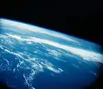 Атмосфера перестаёт поглощать космическую радиацию[44]. Яркость неба ок. 5 кд/м²[45][46]. Выше свечение некоторых явлений может намного перекрывать яркость рассеянного света (см. далее). - 40—80 км — максимальная ионизация воздуха (превращение воздуха в плазму) от трения о корпус спускаемого аппарата при входе в атмосферу с первой космической скоростью[47].
