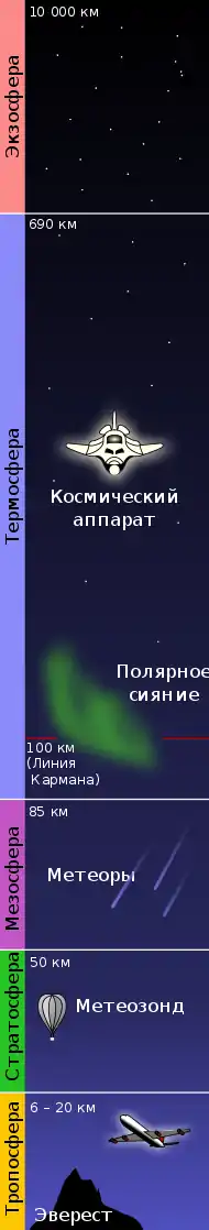 - 60 км — начало ионосферы — области атмосферы, ионизированной солнечным излучением.