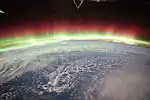 - 1000—1100 км — максимальная высота полярных сияний, последнее видимое с поверхности Земли проявление атмосферы; но обычно хорошо заметные сияния яркостью до 1 кд/м²[76][77] происходят на высотах 90—400 км. Плотность среды 400—500 миллионов частиц на 1 дм³[78][79].