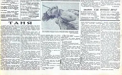 О судьбе Зои Космодемьянской стало широко известно из статьи Петра Лидова — «Таня», опубликованной в газете «Правда» 27 января 1942 года. Автор случайно услышал о казни в Петрищеве от свидетеля — пожилого крестьянина, которого потрясло мужество неизвестной девушки: «Её вешали, а она речь говорила. Её вешали, а она всё грозила им…» Лидов отправился в Петрищево, подробно расспросил жителей и на основе их расспросов опубликовал статью. Её личность была вскоре установлена, об этом сообщила «Правда» в статье Лидова от 18 февраля 1942 — «Кто была Таня». Перед этим, 16 февраля 1942 года Президиум Верховного Совета СССР удостоил Космодемьянскую звания Героя Советского Союза посмертно, за «отвагу и геройство, проявленные в партизанской борьбе в тылу против немецких захватчиков»[32][33].