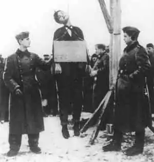 Место казни окружали десятеро конных с саблями наголо. Вокруг стояли больше сотни немецких солдат и несколько офицеров. Местным жителям было приказано собраться и присутствовать при казни, но их пришло немного, а некоторые, придя и постояв, потихоньку разошлись по домам, чтобы не быть свидетелями страшного зрелища.