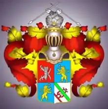 Щит разделён на четыре части, из них в первой части, в красном поле, крестообразно положены две серебряных сабли остриями обращённые в левую сторону и колчан со стрелами. Во второй и третьей частях, в голубом поле, поставлены по одному льву с булавою. В четвёртой части, в серебряном поле, зеленая полоса, диагонально положенная на лире красного цвета.