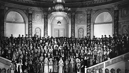 Впечатление получилось сказочное, — писал очевидец события, — от массы старинных национальных костюмов, богато украшенных редкими мехами, великолепными бриллиантами, жемчугами и самоцветными камнями, по большей части в старинных оправах. В этот день фамильные драгоценности появились в таком изобилии, которое превосходило всякие ожидания[4].