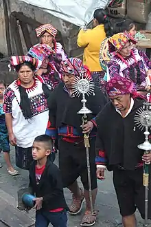 Большинство женских костюмов дополняют разнообразные тюрбаны, которые могут представлять собой как обыкновенный платок, обмотанный вокруг головы, так и весьма сложную, замысловатую конструкцию. Самые оригинальные тюрбаны носят женщины из деревни Сантьяго, расположенной у озера Атитлан. Узкую ленту красного цвета, длиной примерно 12 метров, сплошь расшитую на концах геометрическими узорами, сначала накручивают на косу, а затем обвивают вокруг головы. Такой головной убор создаёт эффект яркого ореола. В качестве дополнительного украшения к нему могут быть пришиты длинные разноцветные кисти.