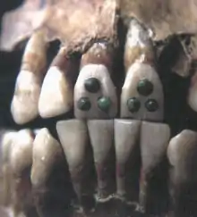 Несмотря на скудость своей одежды, майя любили украшать себя. Уже в младенчестве ребёнку прокалывали мочки ушей, нос и губы для того, чтобы вдевать в них серьги, вставки и лабретки, которые ему предстояло носить в дальнейшем. Передние зубы, резцы и клыки могли быть украшены инкрустацией из нефрита или пирита; для этого на передней стороне зуба высверливали впадину глубиной в несколько миллиметров, в которую затем помещали инкрустацию. Это была не просто дань моде — подобное украшение доказывало мужество его обладателя и его способность переносить боль.