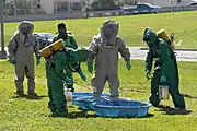 Костюм химической защиты (химкостюм, англ. Hazmat suit) — комплект средств индивидуальной защиты кожных покровов, защищающий тело человека от факторов, возникающих при перевозке опасных грузов на судах, железнодорожном, автомобильном, авиационном транспорте, в местах складирования и перевалки грузов, на предприятиях химической и нефтеперерабатывающей промышленности, а также во всех случаях, когда возникает угроза воздействия растворов кислот и щелочей, сырой нефти и нефтепродуктов, органических растворителей, пылевидных токсичных частиц и других опасных для жизни человека веществ.