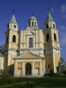 Храм доминирует в ансамбле. Купольный костёл типа ротонды, уникальный для Литвы, построен по образцу костёлов римских тринитариев. Здание сложено из кирпича и покрыто штукатуркой; кровли из жести. Здание храма в плане восьмиугольное и увенчано монументальным куполом с фонарём (высота 34 м). В южной части храма пристроены две четырёхугольных башни.