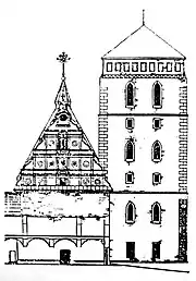 Башня состоит из шести ярусов, сообщение между которыми было через винтовые лестницы, устроенные в полуцилиндричной башенке в северо-восточном углу.