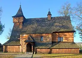 Деревянный костёл построен из лиственницы без единого гвоздя, крепления из деревянных клиньев. Шатровая двускатная крыша покрыта дранкой[3]. В архитектуре сооружения сохраняется связь с народным зодчеством. Пресвитерий костёла ориентирован на восток. Храм сохраняет свою оригинальную структуру, в интерьере сохранилась уникальная позднеготическая трафаретная роспись. В алтаре храма — копия написанной на дереве иконы XIII века (оригинал находится в Вавельском замке в Кракове)[3]. Кроме того, в костёле находятся позднеготический триптих начала XVI века, датируемый 1380 годом крест, табернакль начала XIV века, ксилофон XV века. Из-за высокой пожарной опасности в костёл не проведено электричество, изнутри его освещают только маленькие лампадки[3]. На фасаде сохранился консекрационный крест[4].