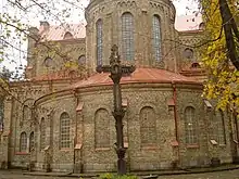 Внушительных размеров здание из жёлтого кирпича в неороманском стиле. Здание в плане формой римского креста, длиной 50 м, шириной 32 м, высотой — 23 м[1].