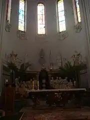 Внутренний объём образуют три нефа, отделённых рядами пилонов. В главном алтаре располагается многофигурная скульптурная композиция по мотивам «Тайной вечери» Леонардо да Винчи [5]. Над нею размещаются мраморные барельефы вильнюсских костёлов и скульптуры. В алтарях трансепта помещаются копии образов Девы Марии Остробрамской и Ченстоховской. В окнах витражи.