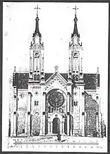 Главный фасад с треугольным завершением возвышается над четырёхскатными крышами квадратных в плане башен по бокам. Фасад декорирован большой розеткой над отделанным колоннами четырёхчастным окном. По обеим сторонам портала в нишах установлены статуи Девы Марии и Распятия.