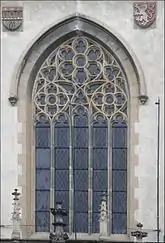 | Центральное окно фасада с масверком | Статуя Святой Людмилы на главных воротах | Костёл Святого Антония Падуанского на площади Штросмайера | Статуя Святого Вацлава на главных воротах | Неоготический фасад храма |