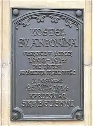Строительство было закончено в 1914 году. 25 октября того же года, в день шестой годовщины заложения костёла, он был освящён архиепископом Праги кардиналом Львом Скрбенским. Поскольку в то время уже началась Первая мировая война, освящение храма прошло без лишних торжеств и финансовых затрат. Первым священником костёла Святого Антония Падуанского стал Антонин Непил[1][2].
