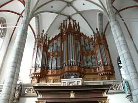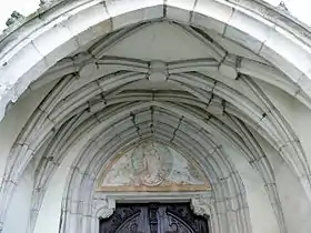 | Северный вход в костёл | Тимпан над северным входом | Сетчатый свод главного нефа и крестовой свод бокового нефа | Неоготическая башня костёла |