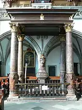 | Купель и колонны рожмберкского алтаря | Главный алтарь костёла | Один из органов костёла | Капелла Воскресения |