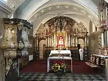 Всю ширину нефа занимает главный алтарь со сложным ордером и волнообразным карнизом. В главном алтаре находится образ Пресвятой Девы Марии, почитавшийся как чудотворный[7]. Копия его написана на фасаде костёла. Правый алтарь пресбитерия отличается высокой художественностью исполнения. Амвон вычурных форм поддерживают статуи ангелов.