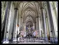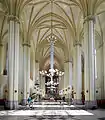 Интерьер с сохранившимся неоготическим амбо и мраморным алтарем в стиле ар-деко