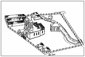 ![]() Реконструкция вида костёла и монастыря | |