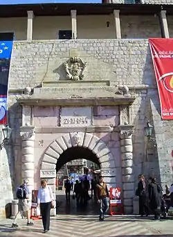 - Морские ворота (главные) — XVI век. Ворота, сложенные из массивных каменных блоков, ведут в проход в толще стены, правая сторона которого украшена готическим барельефом XV века, изображающим Мадонну с Христом, по бокам от которой стоят св. Трифон и св. Бернард.