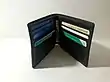 - Бумажник двойного сложения (Bi-fold wallet). Стандартный, очень популярный вид бумажника, в котором купюры сложены пополам. Состоит из нескольких отделений для банкнот и пластиковых карт. Иногда имеется дополнительное отделение для монет. Подходит для ношения как с классической одеждой, так и с одеждой стиля casual.
