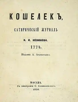 - Кошелек, сатирический журнал Н. И. Новикова. 1774 / Издание А. Афанасьева. — М. : В тип. С. Селивановского, 1858. — 141 с.