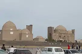 В плане южнотуркменского городища Хурмузфарра, снятой М. Е. Массоном, отмечены два караван-сарая домонгольского времени, стоящие лицом к лицу по системе кош, но разделенные, видимо, городской стеной[5].