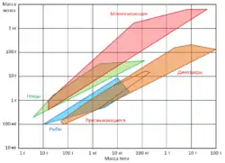 В биологии часто встречаются ситуации, когда какой-то параметр живого организма зависит от другого параметра (например, масса мозга от массы тела) по более сложной зависимости, чем прямая пропорциональность. Как показывают исследования, наиболее часто такие зависимости описываются так называемым аллометрическим уравнением, которое в общем виде представляет собой степенную зависимость[11]