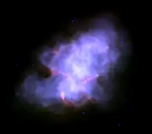 Крабовидная туманность. Это изображение получено путём совмещения данных оптического диапазона (красный) с телескопа Хаббл и рентгеновских изображений с телескопа Чандра (синий).