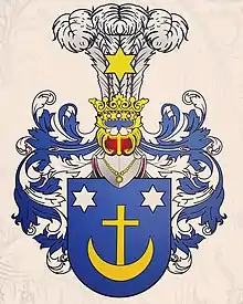 Описание герба: В щите, имеющем голубое поле, изображены золотой крест стоящий на полумесяце рогами обращёнными вверх, по сторонам его две звезды. Щит увенчан обыкновенным дворянским шлемом с дворянской на нём короной и тремя страусовыми перьями на которых тоже звезда. Намет на щите голубой, подложен серебром. |