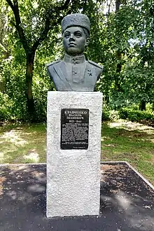 Бюст Василию Кравченко на Аллее Героев-земляков в Яготине - В родном селе Годуновка Яготинского района Герою установлен памятник, на здании школы, в которой он учился, — мемориальная доска.