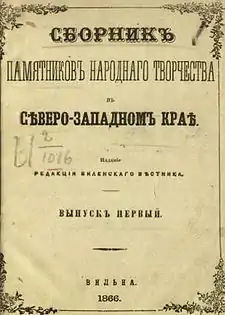 Директор виленского училища, член Общества любителей русской словесности, историк и фольклорист-славист П. А. Бессонов, в 1864―1867 годах, возглавлявший Виленскую археографическую комиссию, издал сборник песен-литаний старцев «Калики перехожие», в который вошли и белорусские песни. В 1871 году выпустил в Москве сборник «Белорусские песни с подробными объяснениями их творчества и языка, с очерками народного обряда и всего быта» с волочебными, юрьевскими, никольскими, купальскими и колядными песнями[109]. Бессонов писал о Беларуси