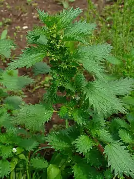 Листья супротивные, тёмно-зелёные, мелкие, 2—6 см длиной, овальные или яйцевидные, острые, пильчатые, покрытые жгучими волосками.