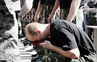 - Вручение крапового берета производится при общем построении воинской части (участников экзаменационных испытаний) в торжественной обстановке. Военнослужащий, успешно прошедший все испытания, получает берет, целует его, становясь на правое колено, надевает на голову, поворачивается к строю, прикладывает руку к головному убору и громко произносит: «Служу Российской Федерации и спецназу!» (ранее «Служу Отечеству и спецназу!»)