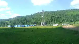Нефтедобыча. Вышка, установленная в селе, относится к Байряшскому месторождению.