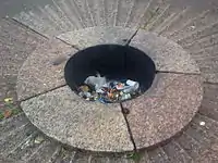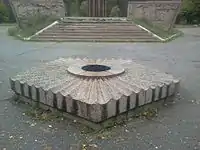 Чаша с вечным огнём выполнена в виде пятиугольника из тёсаного камня, горизонтальная поверхность обработана глубокими каннелюрами, расширяющимися от центра. Ранее в центре находился бронзовый круг в форме верхней части венка из листьев, перевитого лентой.