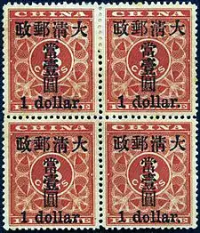 20 марта 1896 года правительство Цин одобрило план создания национальной почтовой службы под контролем Таможенного управления.[5] При открытии почтовой службы в феврале 1897 года заказанные из Японии почтовые марки «Извивающийся дракон» не были доставлены вовремя, поэтому, чтобы удовлетворить спрос, на лежащих без дела красных фискальных марках номиналом 3 цента была сделана надпечатка. Известны надпечатки пяти номиналов: 1 ц, 2 ц, 4 ц, 1 доллар и 5 долларов.[1][2]