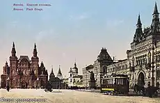 Летом 1909 года по Красной площади был пущен трамвай: первую линию рельс проложили в виде петли от Забелинского проезда к Верхним торговым рядам, далее — к памятнику Минину и Пожарскому в центре площади и собору Василия Блаженного. Затем маршрут следовал по Васильевскому спуску на Москворецкий мост[51][52][53]. На фотографиях начала века уже видны тонкие дорожки из асфальта, положенные прямо на булыжную мостовую. С 1938 года на площади разрешили движение автотранспорта[54][55].