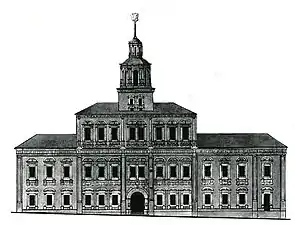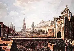Конец XVII века стал расцветом архитектурного ансамбля Красной площади. В 1681 году царский указ запретил деревянное строительство, поэтому она стала почти полностью оформлена каменными зданиями и получила новый парадный въезд: обновлённые Воскресенские ворота с декоративным шатровым навершием и двуглавыми орлами[33]. В 1697-м был возведён Монетный двор, стены Кремля побелили, а к Покровскому собору пристроили два новых парадных крыльца[34].