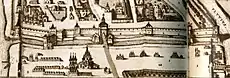 Это деление площади на три части сохранялось вплоть до первой половины XVII века[23]. Несколько небольших участков также имели отдельные названия: например, площадка у Казанского собора называлась «Вшивая», потому что практически постоянно была покрыта толстым слоем волос: по свидетельствам немецкого путешественника Адама Олеария, в Великий четверг москвичи приходили на Красную площадь стричься, «тогда <…> земля у Посольского двора устилалась волосами, как мягкими тюфяками»[24]. Вокруг деревянной церкви Троицы на рву образовалась Троицкая площадь, это название использовалось почти век. На начало XVI века на Красной площади было ещё тринадцать церквей[25].