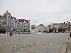 Самая старая часть архитектурного комплекса площади ныне утрачена — в 1877 году посередине северо-западной стороны по проекту архитектора Ф. Оденваля были построены два деревянных одноэтажных жилых здания. В 1904 году они были перестроены по проекту Ауга Карлссона: были добавлены стеклянные витрины, а к обоим зданиям сделаны узкие пристройки, облицованные камнем. В одном из зданий размещался магазин губернской тюрьмы. Оба здания не сохранились, в советское время на их месте планировалось построить здание горкома КПСС и исполкома горсовета со встроенной трибуной. На этом участке до конца XX века размещалась трибуна, а в 2005 году построено современное жилое здание c коммерческими помещениями на нижних этажах. К нему примыкает трёхчастное многоквартирное здание с банковским корпусом и учреждениями культуры, возведённое в 1938 году по проекту О. Каллио в стиле функционализма.