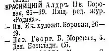 - Красницкій Алдръ. Ив. Боровая, 26-19. Имщ. ред. жур. «Родина» // Алфавитный указатель жителей города С.-Петербурга, Царскаго села, Павловска и Гатчина / А.С. Суворин. — СПб.: Весь Петербургъ, 1896. — Т. III. — С. 165. — 378 с. — (Весь Петербургъ на 1896 годъ. Адресная и справочная книга г. С.-Петербурга).