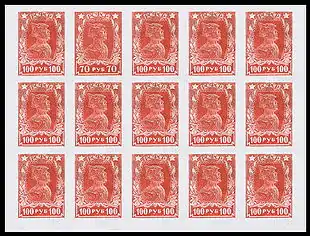 - На иллюстрации представлена часть неперфорированного листа из 14 стандартных марок РСФСР номиналом в 100 рублей (ЦФА [АО «Марка»] #80; Mi #211B) и одной ошибочной марки в 70 рублей (ЦФА [АО «Марка»] #75а; Mi #210BF).