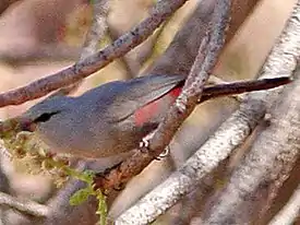 Длина тела 11 см. У самца темя, спина и кроющие крыла голубовато-серые; оперение на спине отливает красноватым. Надхвостье и верхние кроющие хвоста ярко-красные. Рулевые чёрные с теневыми поперечными полосами, которые очень заметны, когда свет падает на них под углом[2]. Клюв серо-чёрный с красным основанием; от него тянется чёрная уздечка, которая имеет продолжение за тёмно-коричневым глазом в виде сужающейся чёрной полоски. Стороны головы целиком светло-серо-голубые до беловатого. Под клювом маленькая чёрная бородка на светло-голубовато-сером фоне горла. Грудь в верхней части тоже светло-голубовато-серая, но с заметным розовым отливом, книзу переходит в серый цвет. Бока с широкими ярко-красными полосами. Маховые тёмно-коричневые, подхвостье и нижние кроющие хвоста чёрные. Ноги серо-коричневые.