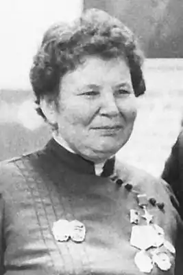 За большие заслуги в досрочном выполнении заданий девятой пятилетки и принятых социалистических обязательств Указом Президиума Верховного Совета СССР от 16 июня 1975 г. ей было присвоено звание Героя Социалистического Труда.